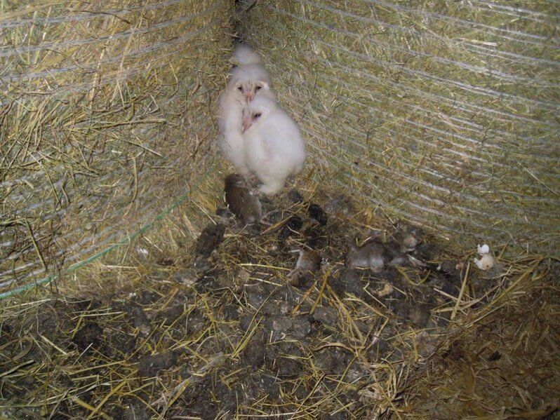 A bálák közül 3 bagolyfióka pislogott rá. Ráadásul körülöttük terülj-terülj asztalkám volt! Mindenféle finom rágcsálnivalók – pockok, kismadarak, amiket a gondos bagolyszülők hordtak össze a fiókáiknak.