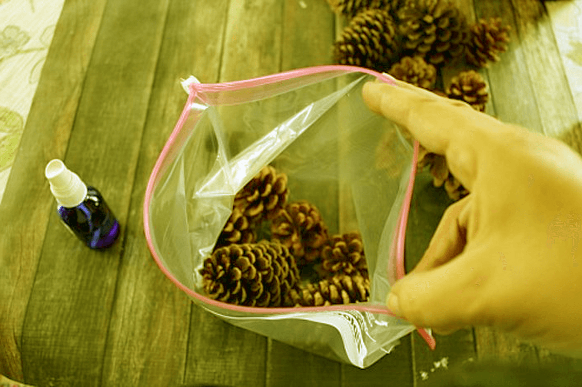 Rápermetezzük a tobozokra az illóolajakat. Egy szórófejes flakonba keverjünk össze vizet és illóolajakat. A tobozokat 3 részletben fogjuk bepermetezni. Tegyük a tobozok 1/3 részét egy zacskóba és permetezzük be, helyezzük rá a második részt majd azt is permetezzük be, ugyanígy járjunk el a harmadik résszel is. Zárjuk le a zacskót és hagyjuk így 3 napig, 1 hétig.